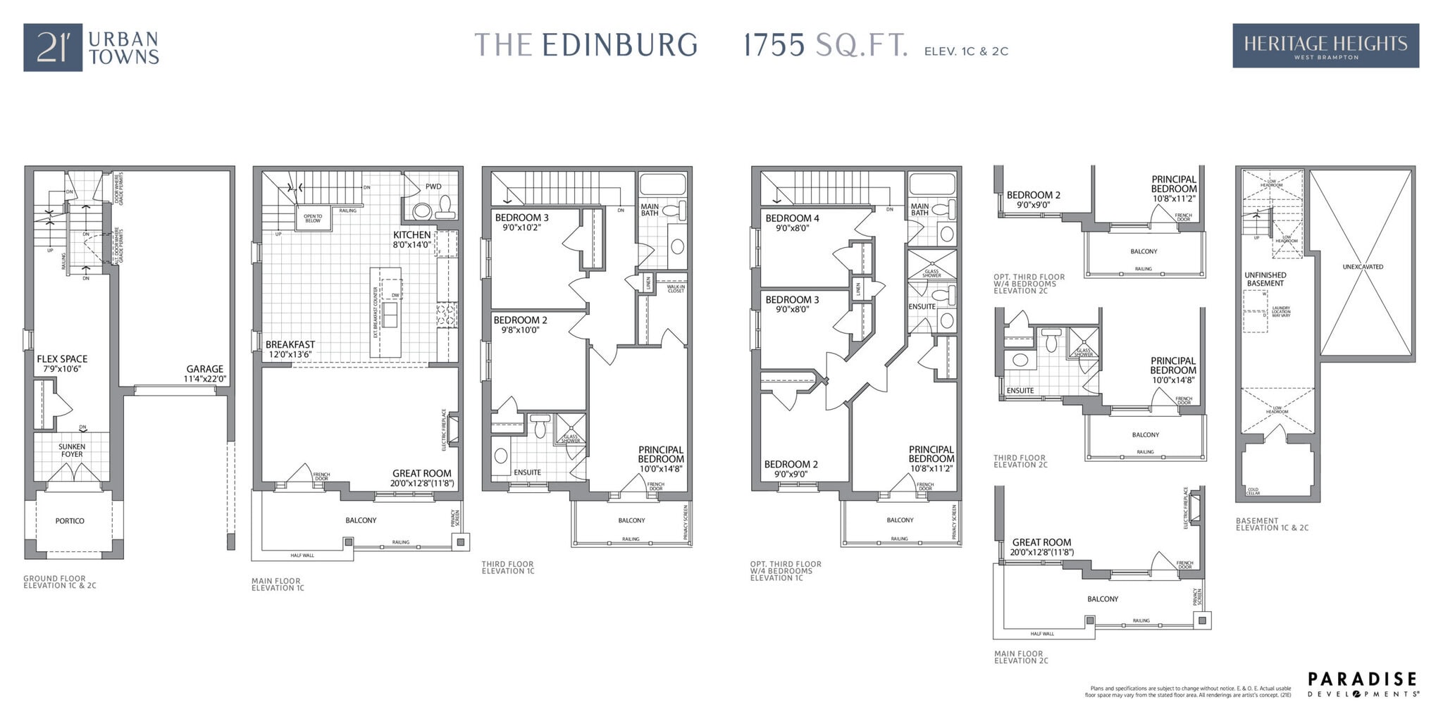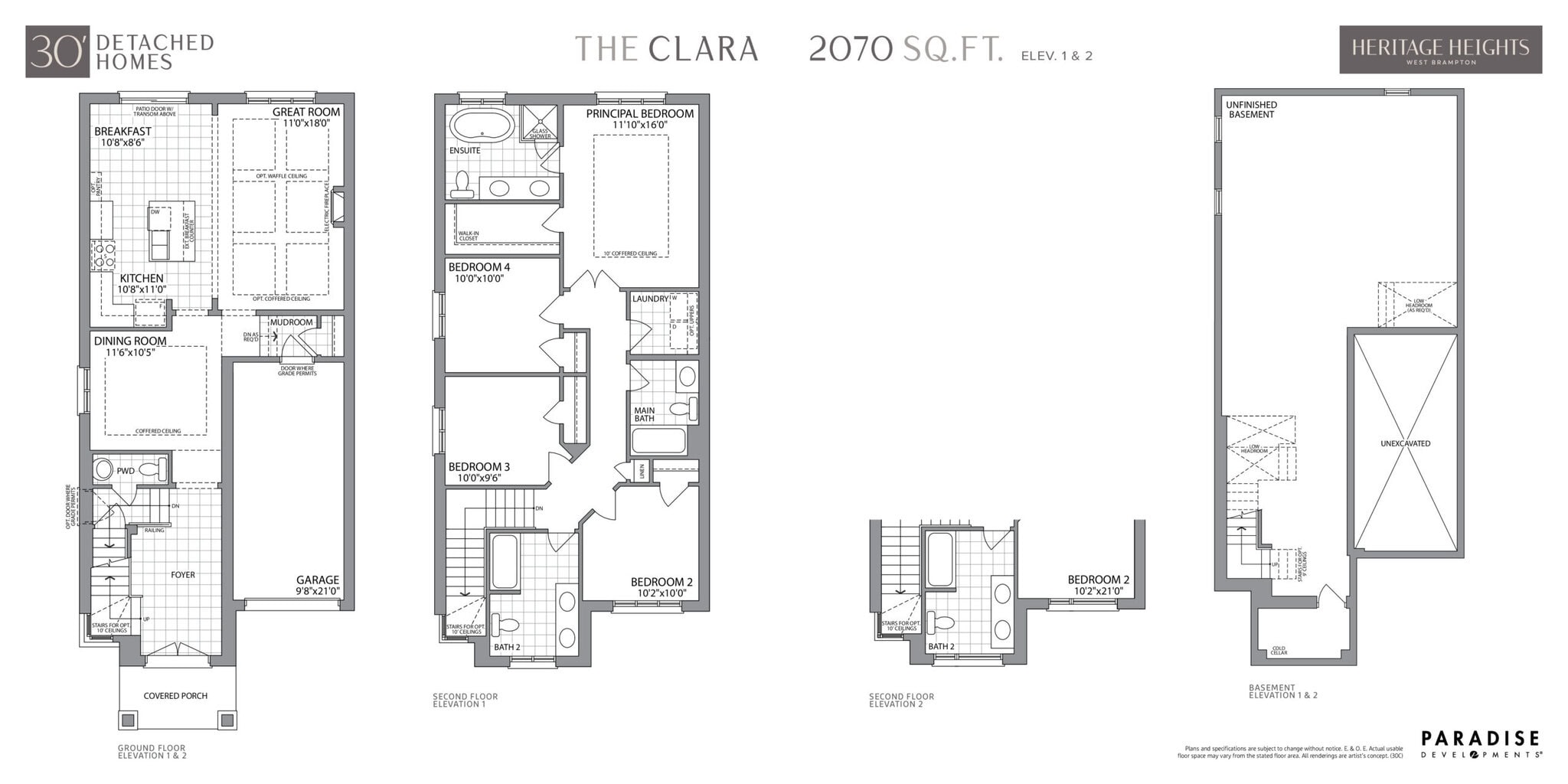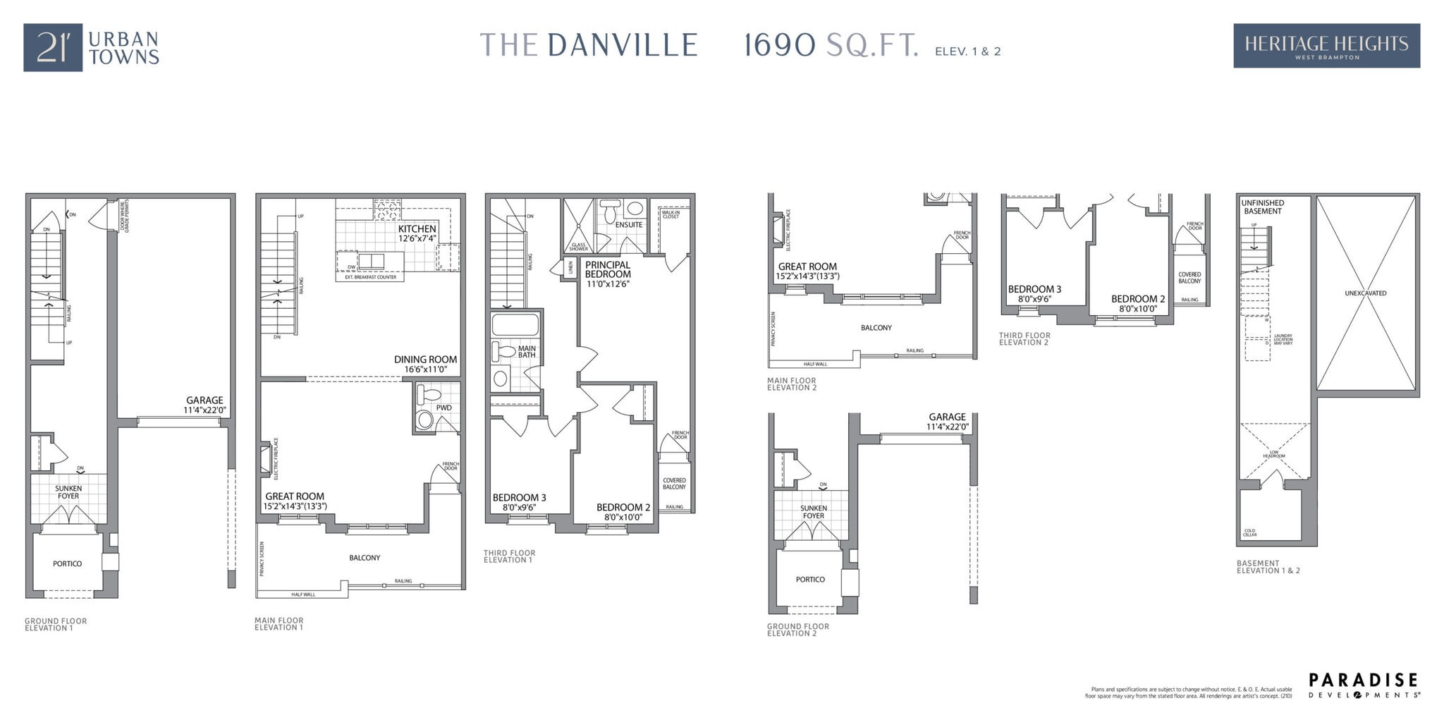 21. 9' ground floor ceilings and second floor ceilings, as per plan (Street Towns & Detached). 8' ground floor ceilings and 9' main and third floor ceilings, as per plan (Back-to-Back 3-Storey Towns). 9' ground, main, and third floor ceilings, as per plan (Laneway Towns & Dual Frontage 3-Storey).