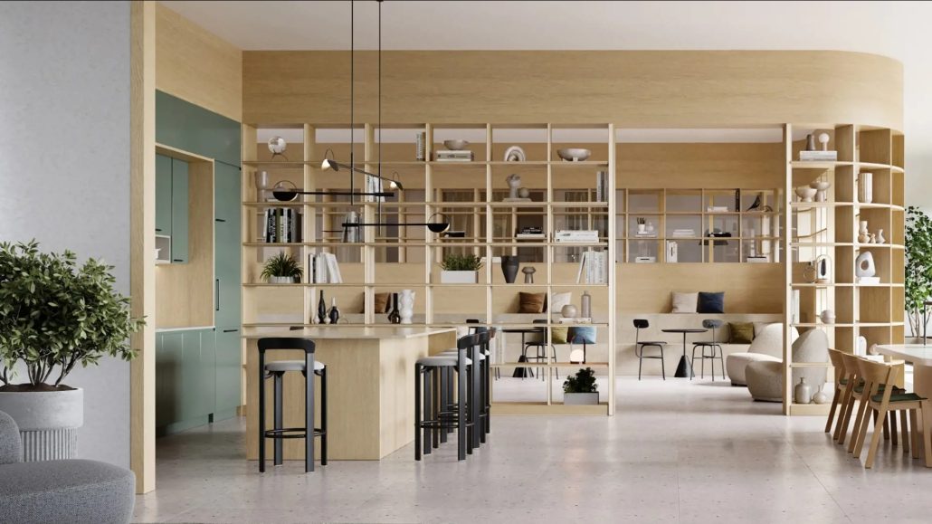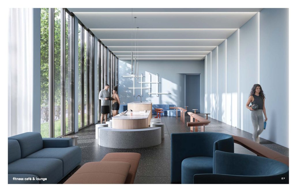 Multi-purpose common areas and lounge spaces including dining, hobby spaces, and co-working areas