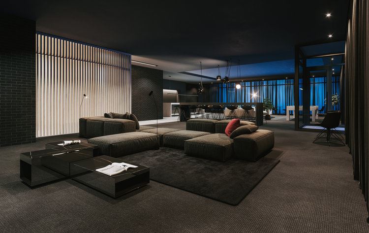 - Stylish lobbies, clad in black brick, warm woods and board-formed concrete (Phase 1), with seating area, concierge desk, and mail and package rooms