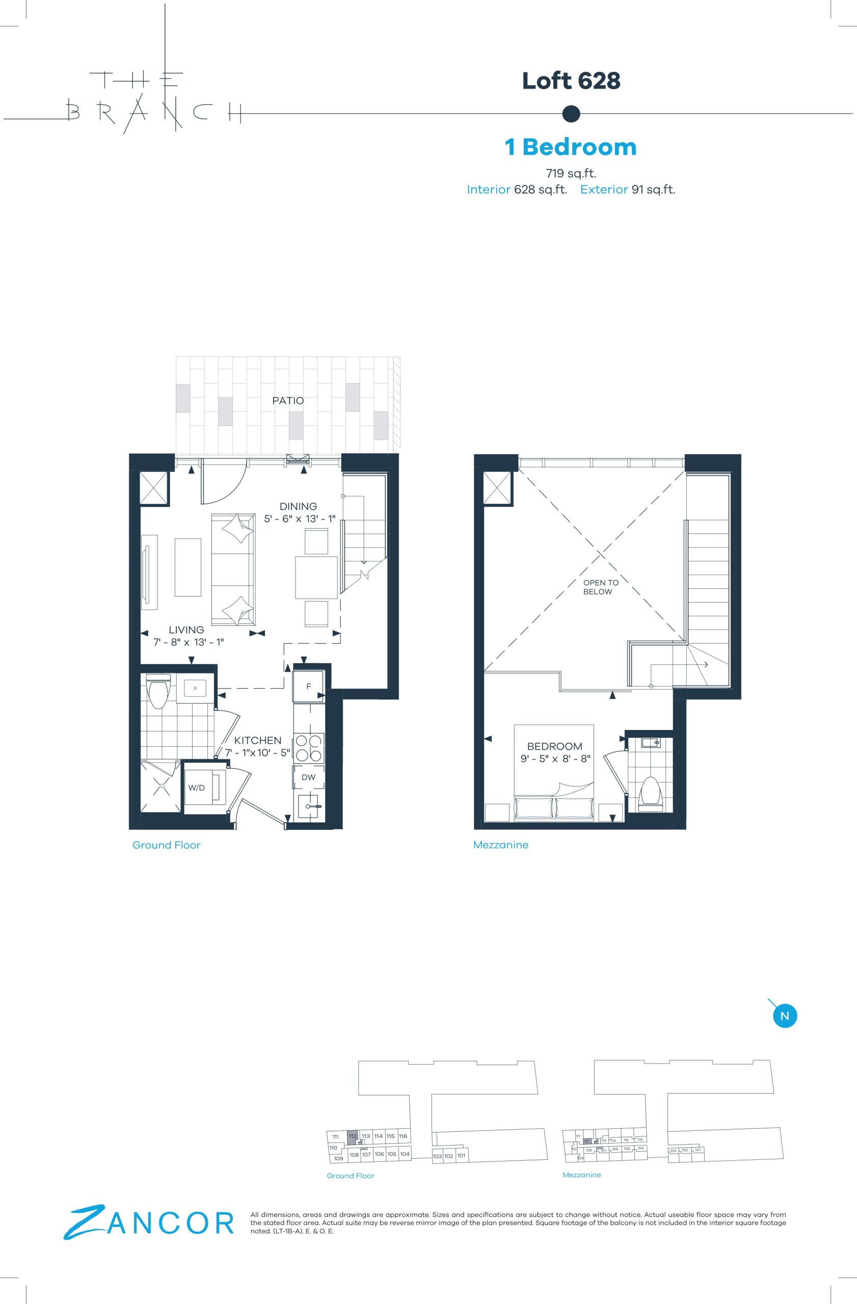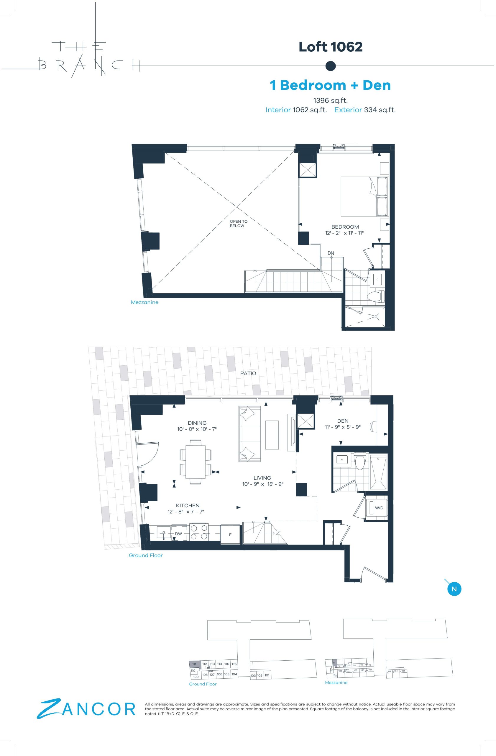• Lofts feature approximate 18' ceilings, bottom – 9'-0", upper – 9'-0", as per plan.