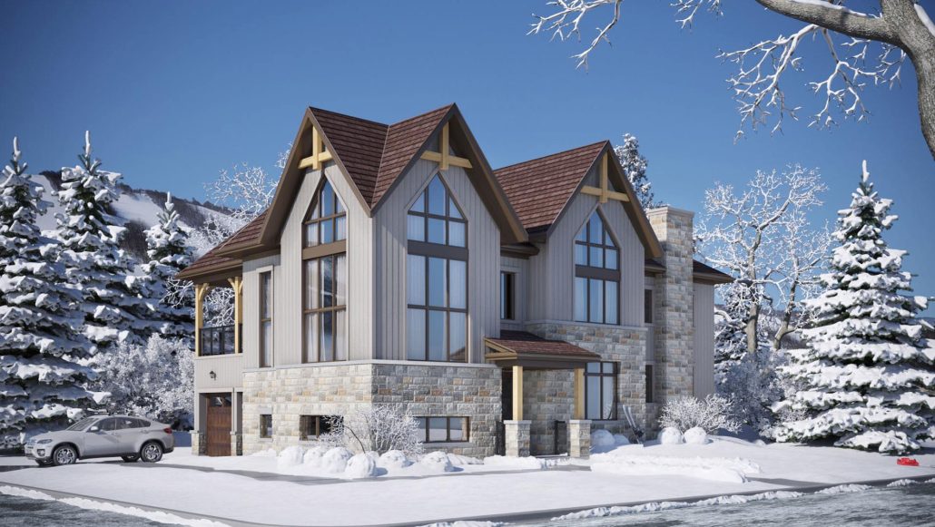 2. Unique combinations of man-made stone, high quality genuine prefinished natural wood siding and wood grain look metal siding together with ornamental details in other materials, to accentuate the theme of each elevation.