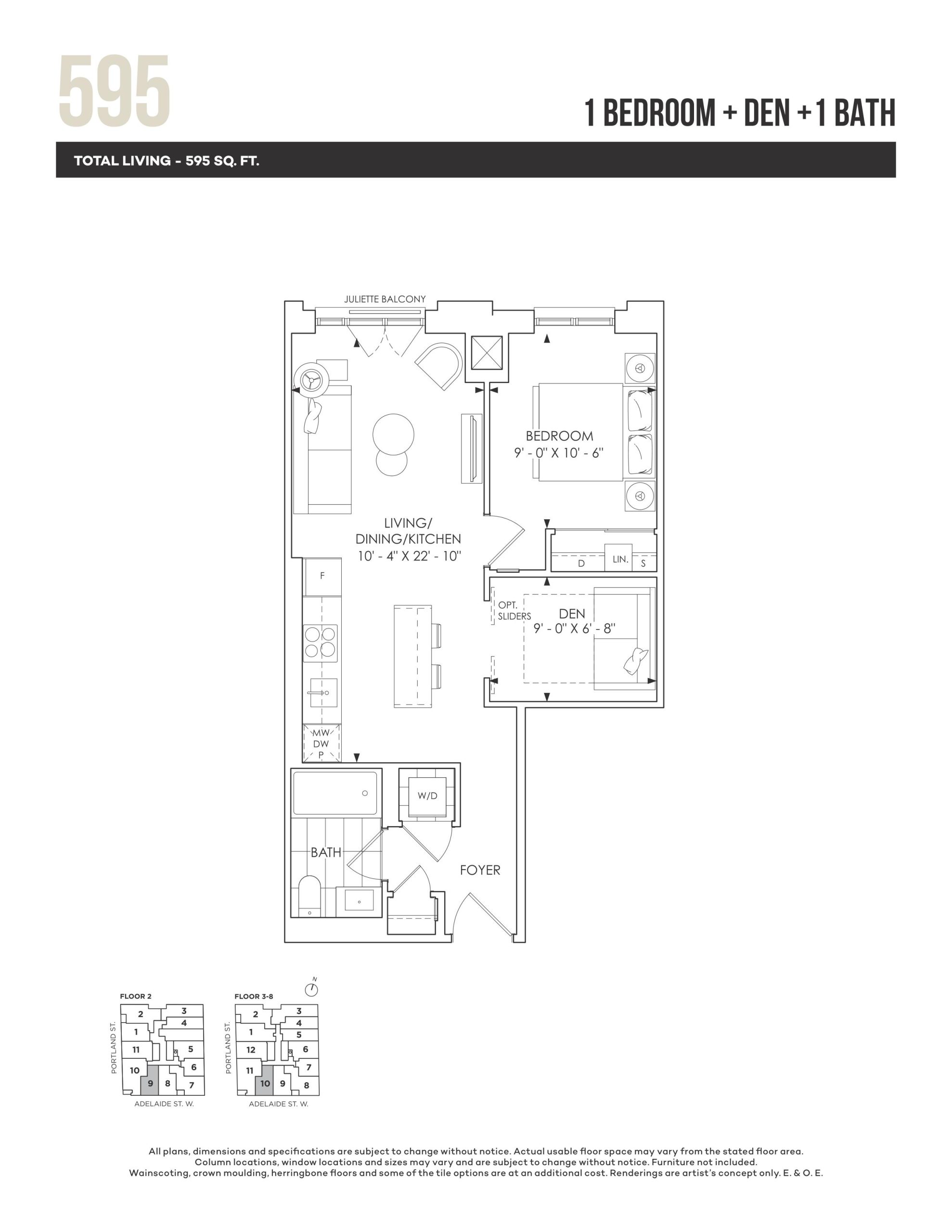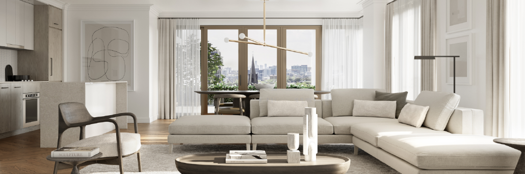 Every suite is outfitted with unparalleled quality and attention to detail. Integrated Miele appliances compliment stone countertops and tile backsplashes in the kitchen, while hardwood floors give way to French doors in the living space. Select primary bedroom will also feature French doors, allowing natural light to offer stunning views of the city landscape below.