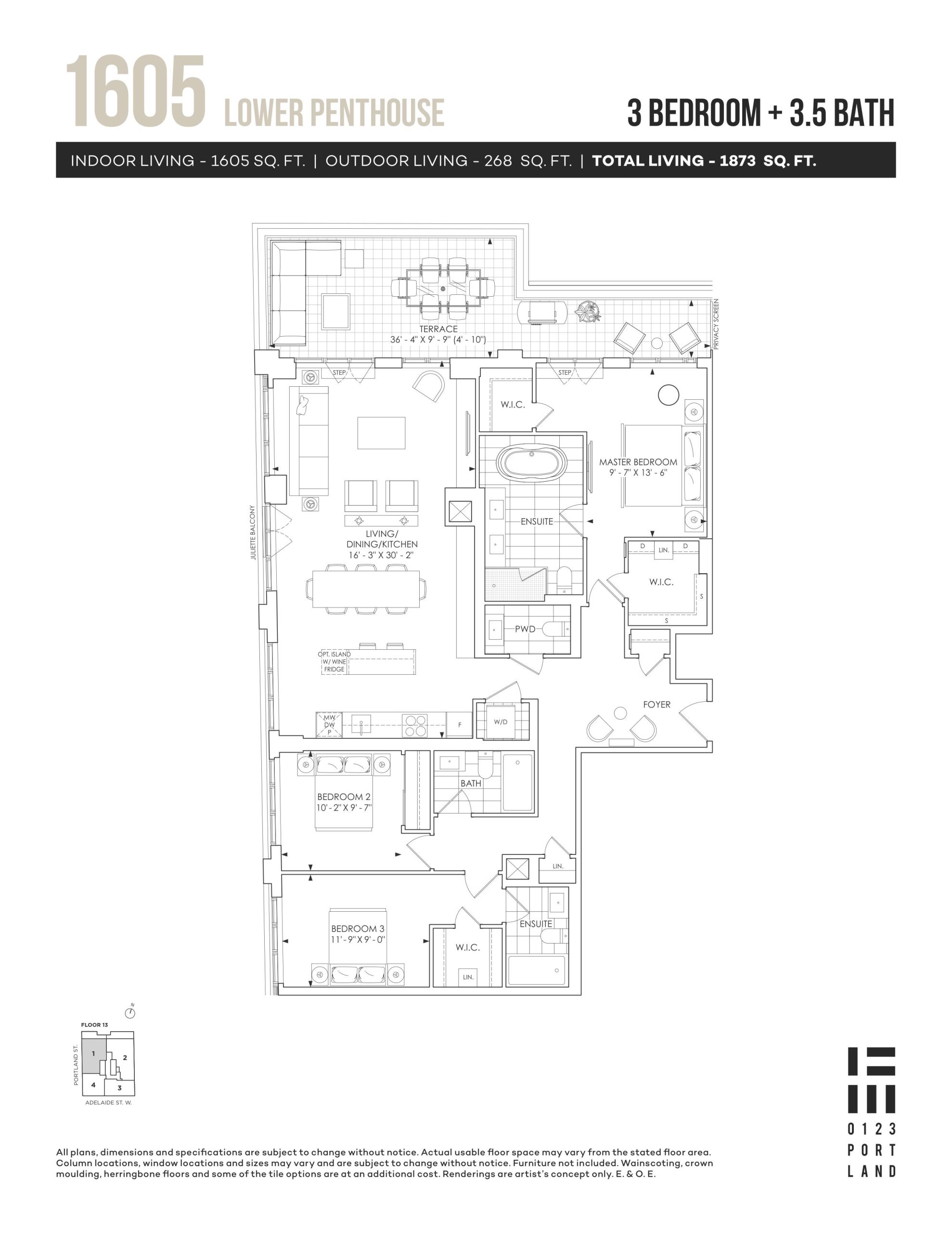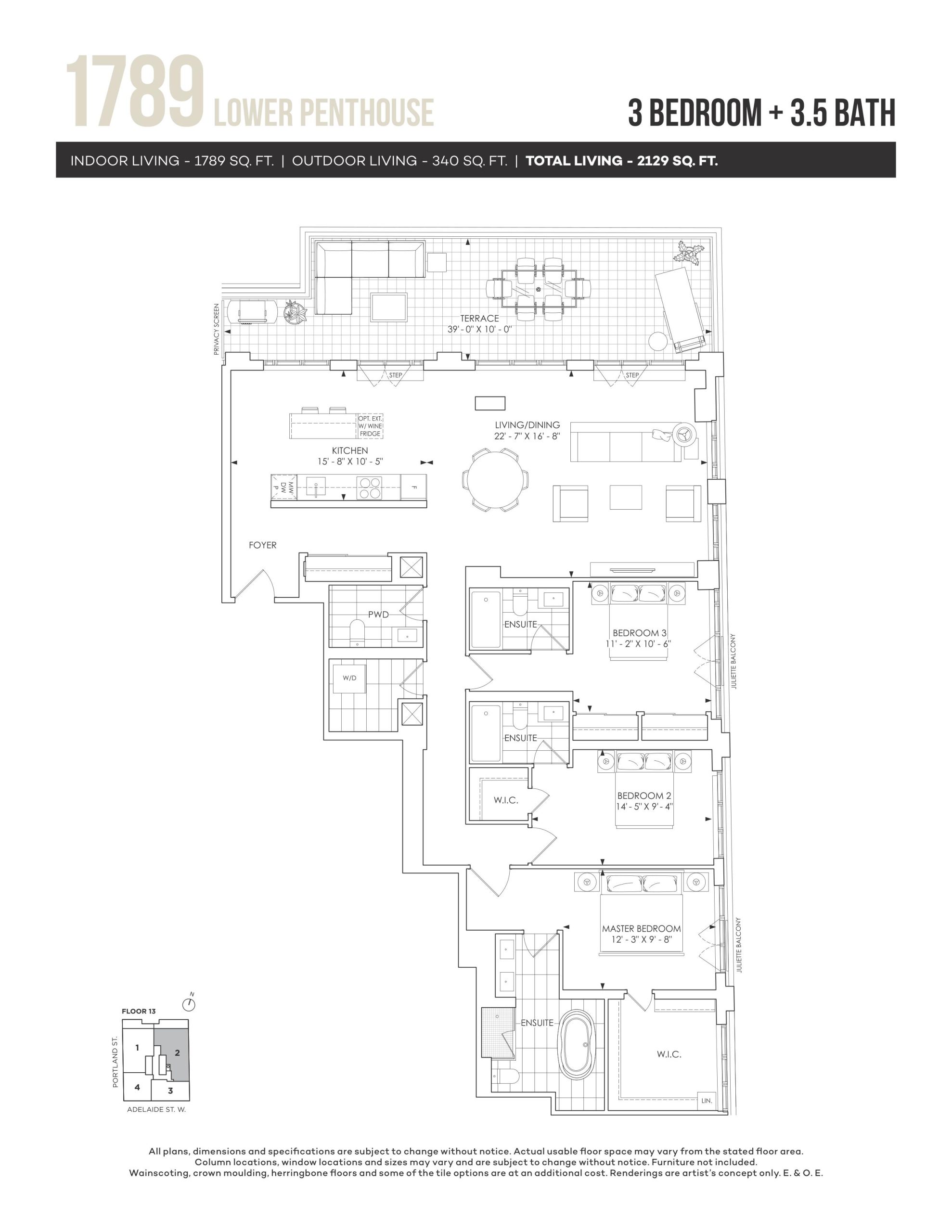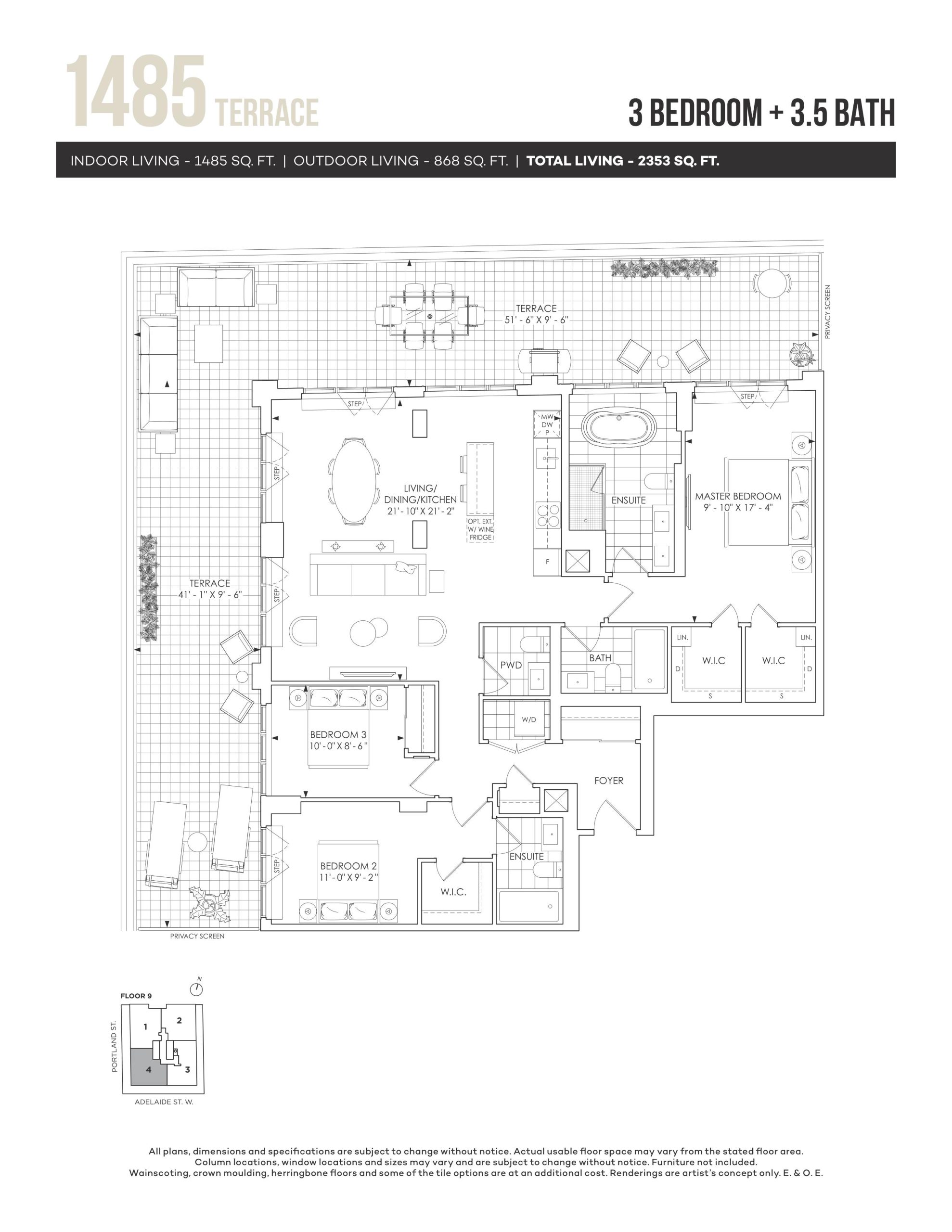 The terrace suites lay basking in panorama views. Standing at 9 and 13-storeys high, each immaculate suite enjoys a sunlit private terrace, expansive walk-in closets and three naturally lit bedrooms and bathrooms. Thoughtfully designed as open and opulent, the suites are embellished with the same lavish details that define 123 Portland.