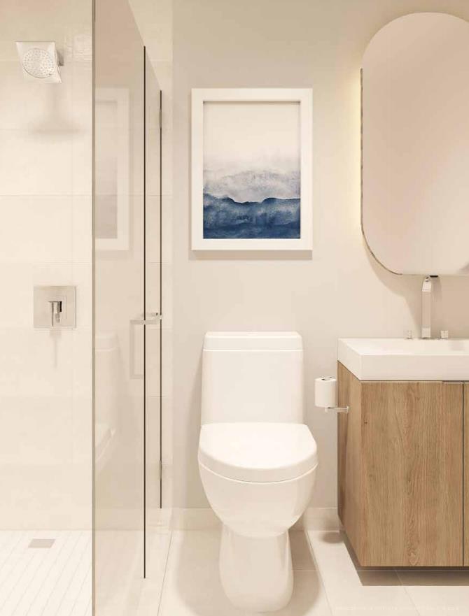 Choice of full height porcelain wall tiles in tub and shower enclosures, from builder’s samples