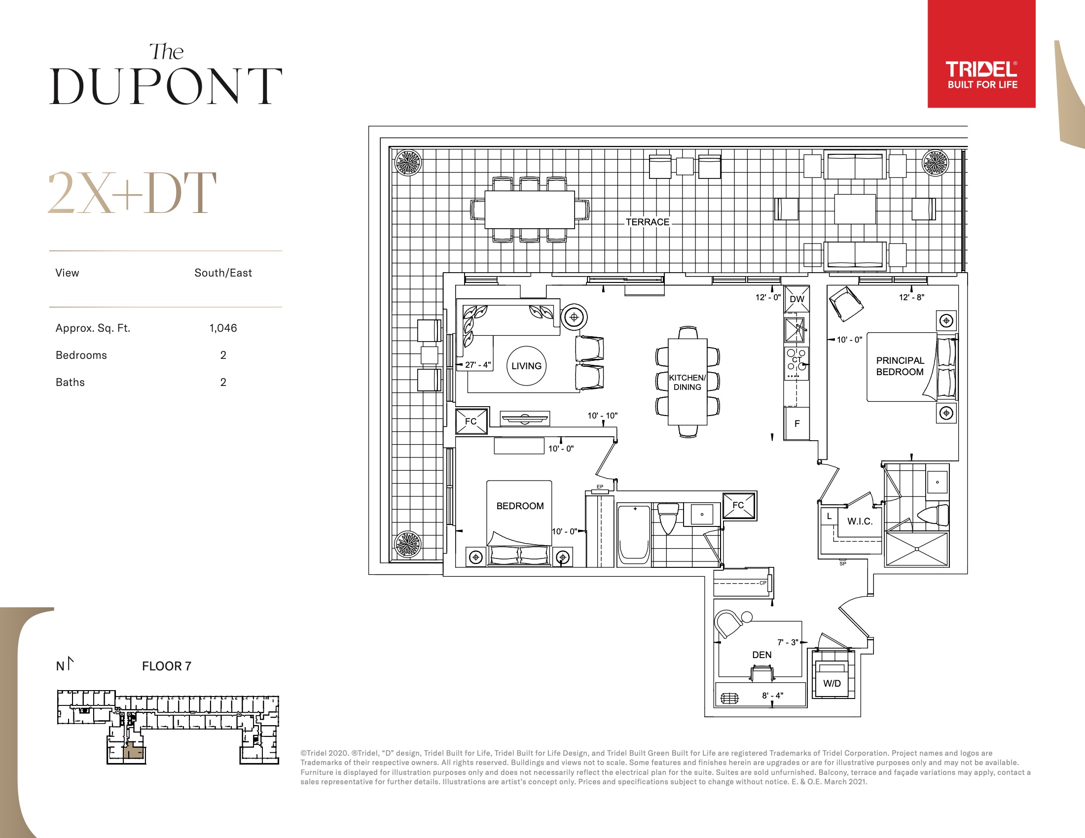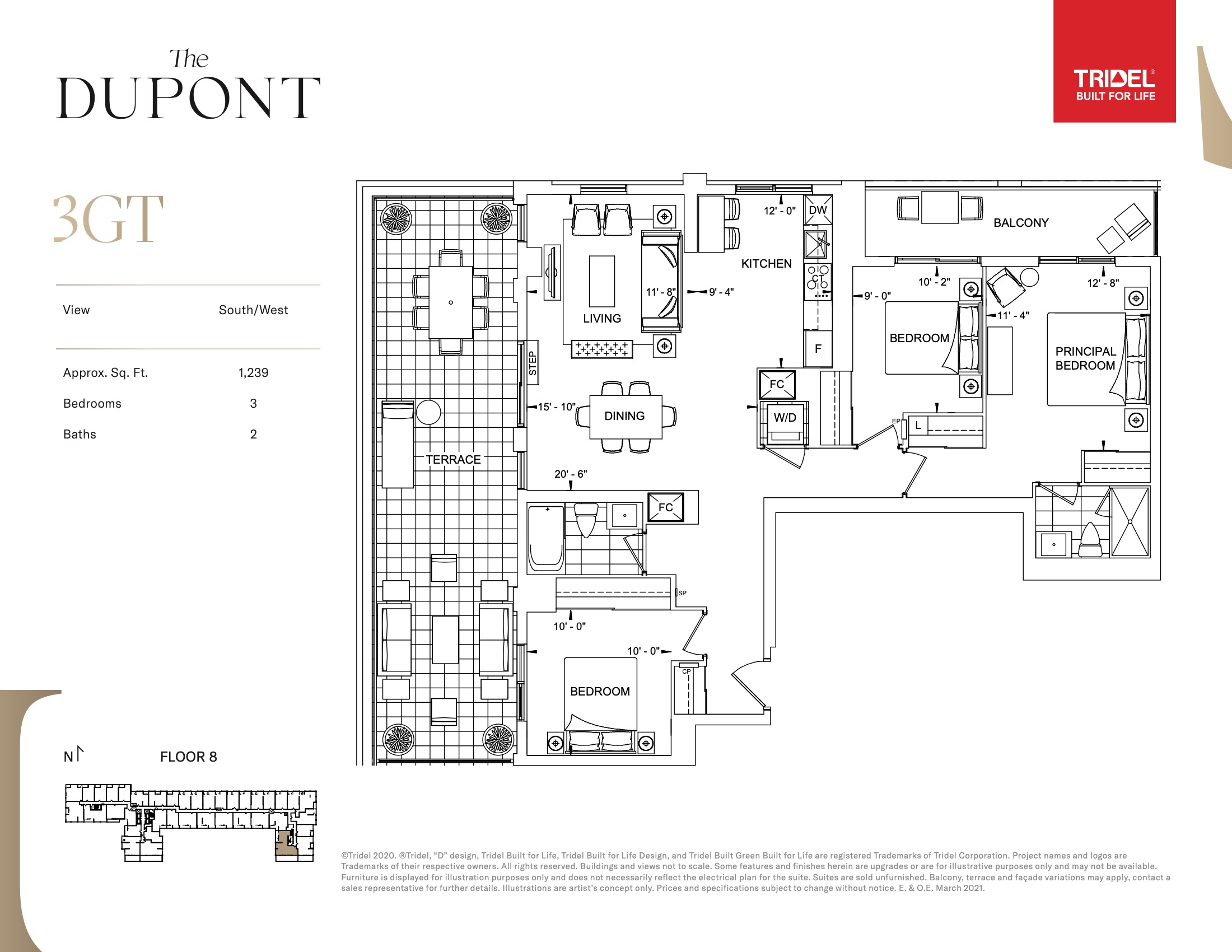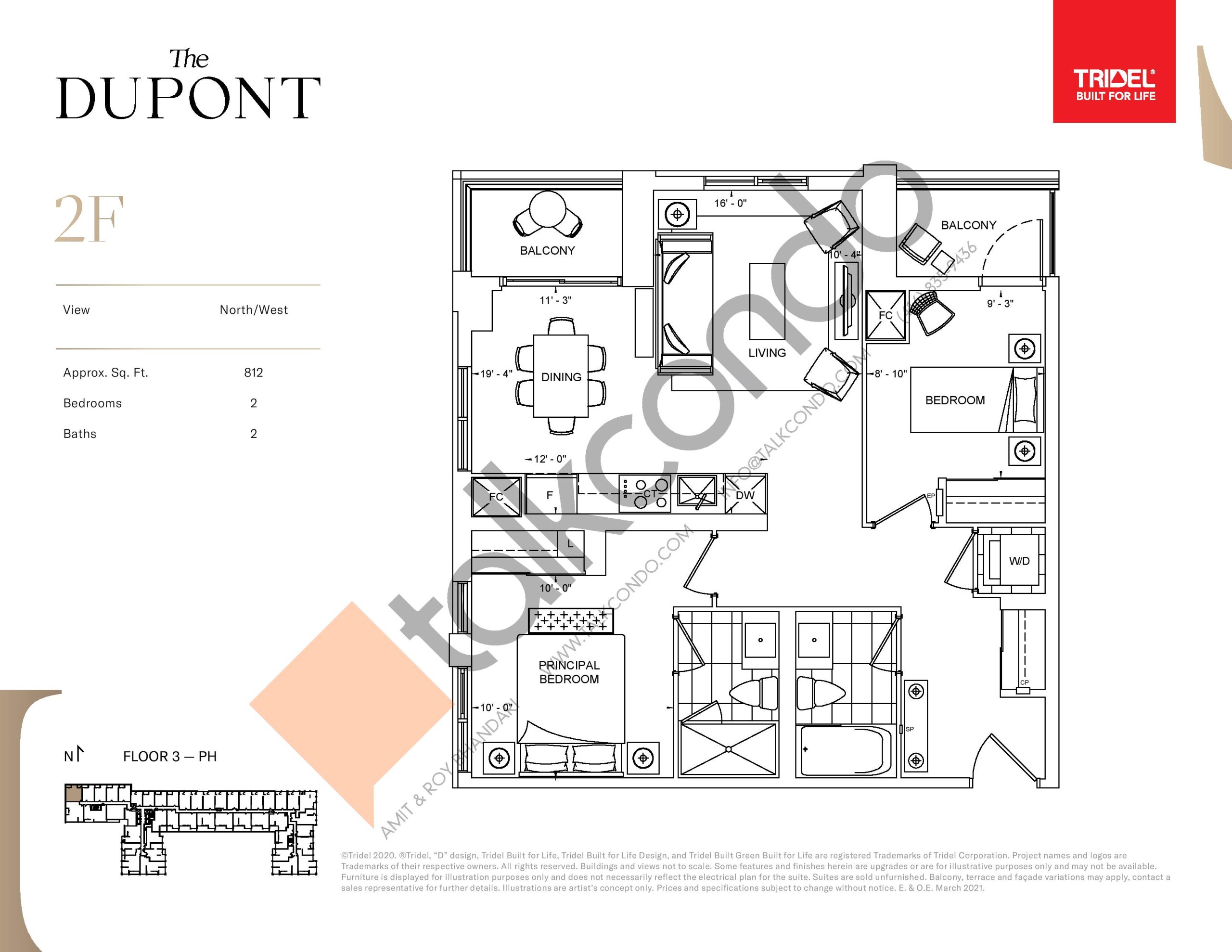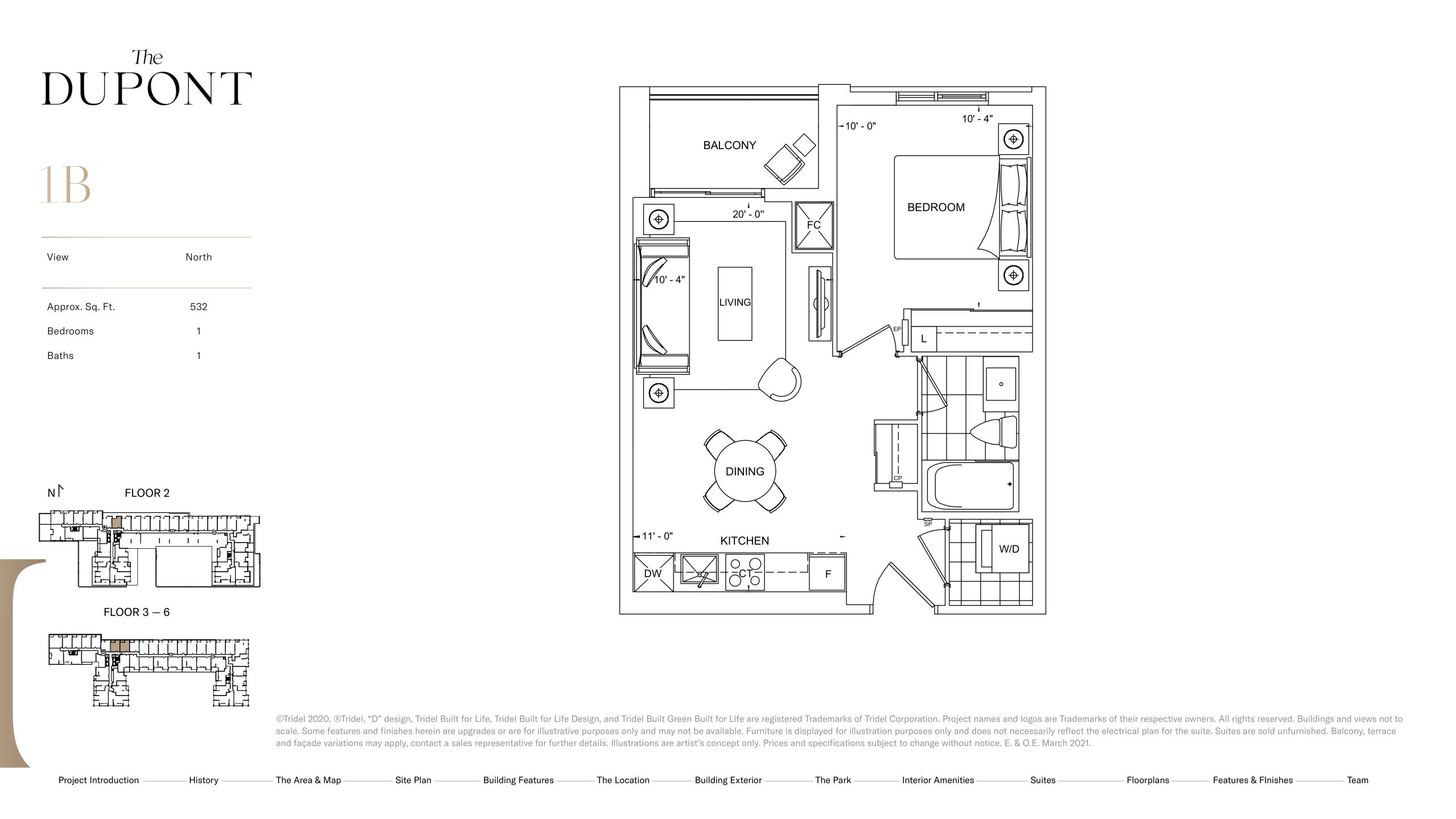 The Dupont Condos is a new condominium development by Tridel currently under construction located at 840 Dupont Street, Toronto in the Davenport-Wychwood neighbourhood with a 70/100 walk score and a 81/100 transit score. The Dupont Condos is designed by Turner Fleischer Architects and will feature interior design by U31. Development is scheduled to be completed in 2025. The project is 9 storeys tall (36.55m, 120ft) and has a total of 329 suites ranging from 532 sq.ft to 1288 sq.ft. The Dupont Condos is the # tallest condominium in . Suites are priced from $1,040,000 to $1,840,000.