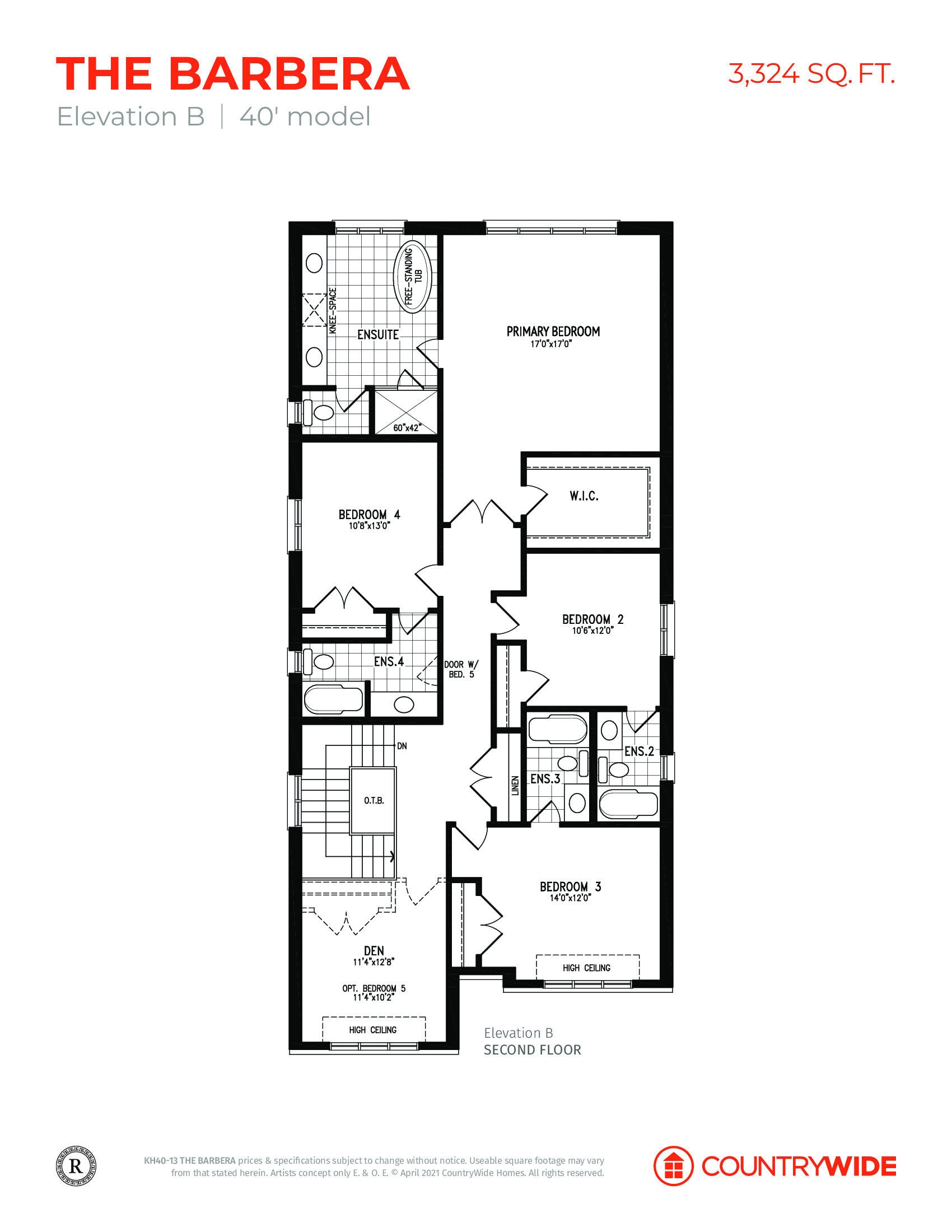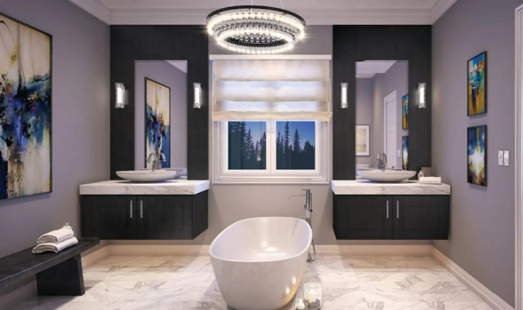 • Primary Ensuite to include frameless glass door with chrome hinges and knob, shower enclosure with mosaic floor tile, two recessed waterproof pot light, one ceiling mounted rain shower head and one handheld shower fixture. Primary ensuite to include free standing tub with deck mounted faucet.