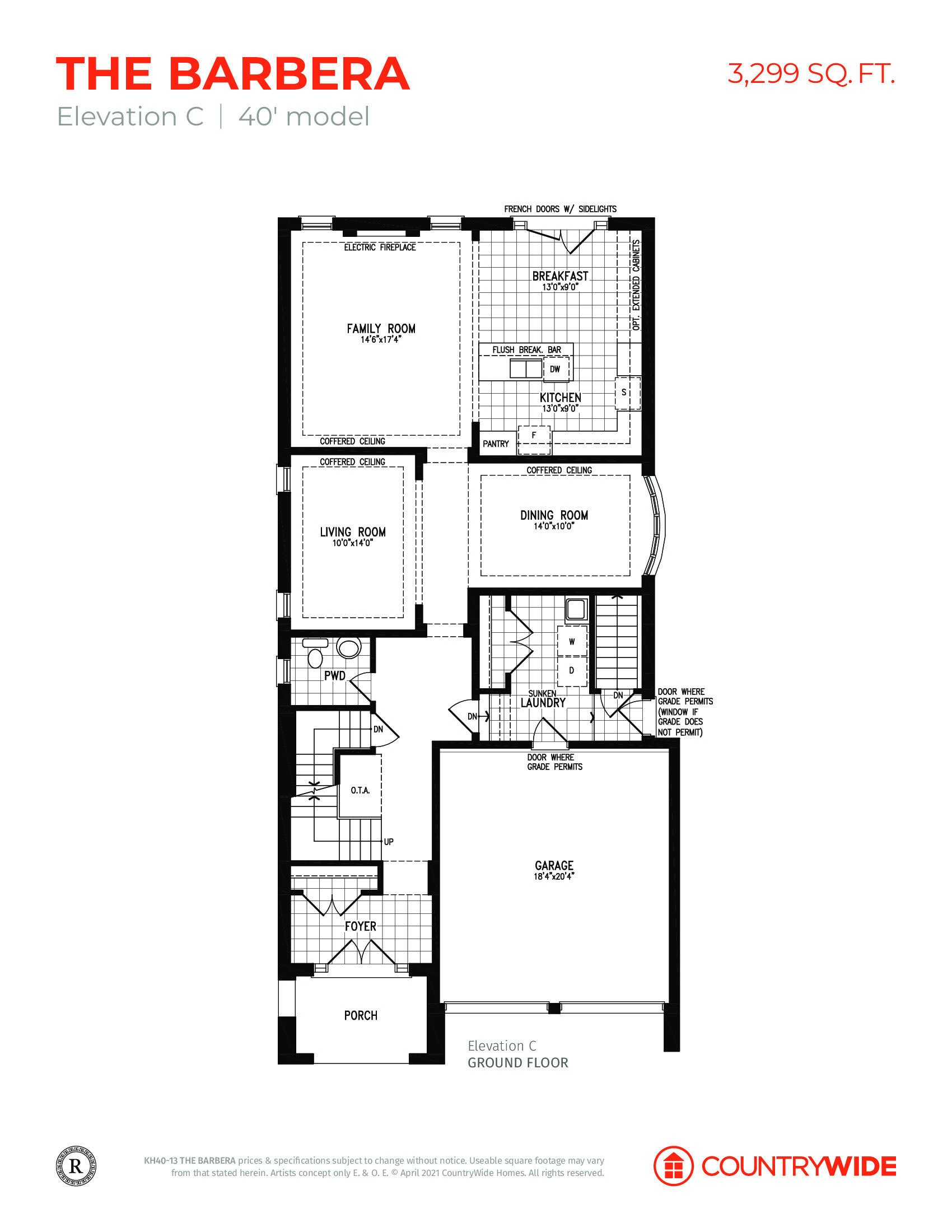 • 12”x24” tile flooring in foyer, main hall, kitchen, breakfast area, powder room, laundry room and all bathrooms, (as per plan).